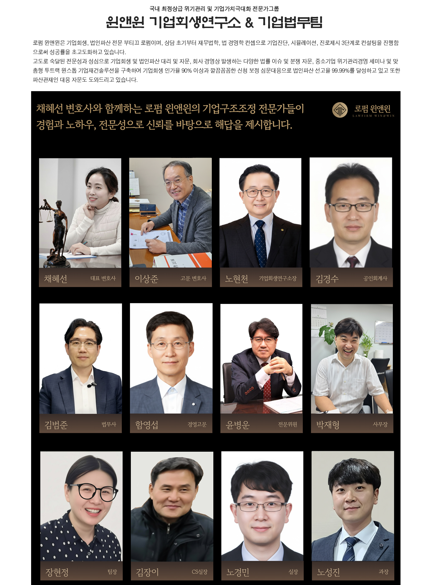 로펌 윈앤윈 | 대표자: 채혜선 | (06634) 서울특별시 서초구 서초중앙로22길 17(서초동), 메가스터디 서초오피스빌딩 2층TEL : 18111-428(전국대표), (02)588-8114, 010-6541-1145(긴급) | FAX : (02)6008-7116 | E-mail : hoisaeng@naver.com 광고책임 : 변호사 채혜선 | Copyright (c) 2023 로펌 윈앤윈 변호사 채혜선 기업회생연구소(Joseph) All Rights Reserved.
